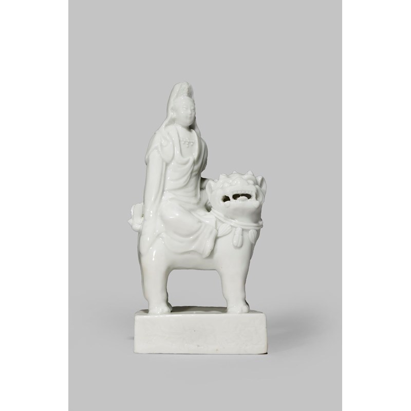 A CHINESE BLANC DE CHINE MODEL OF GUANYIN KANGXI 1662-1722 Seated on the back of a large Buddhist...