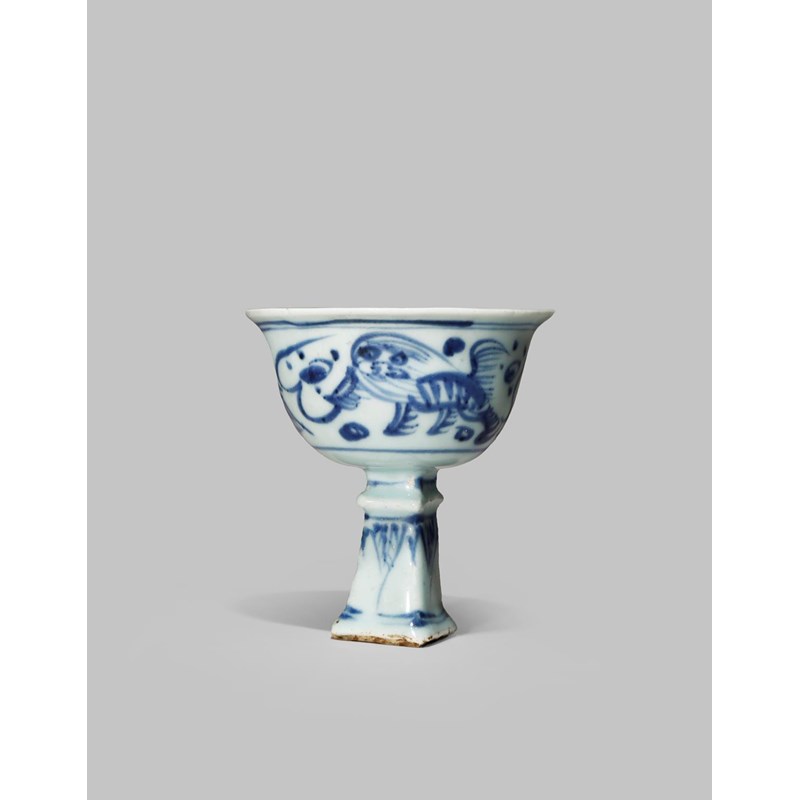A CHINESE BLUE AND WHITE STEM BOWL PROBABLY YUAN DYNASTY The U-shaped bowl raised on a...