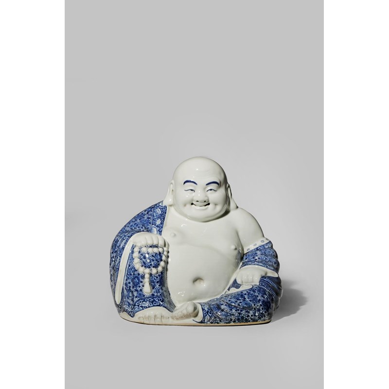 A CHINESE BLUE AND WHITE FIGURE OF BUDAI HE SHANG 20TH CENTURY Seated holding a rosary