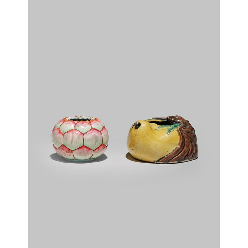 Formed as a lotus flower, with moulded petals radiating from the base, together with a water dropper formed as a gourd with a bat clambering to one corner, 10.3cm. (2)