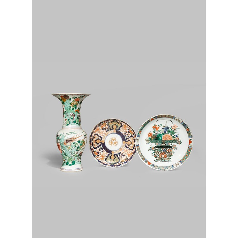 Painted with a pheasant, rockwork and flowers, together with a famille verte and a Japanese Imari dish, both early 18th century, 46cm. (3)