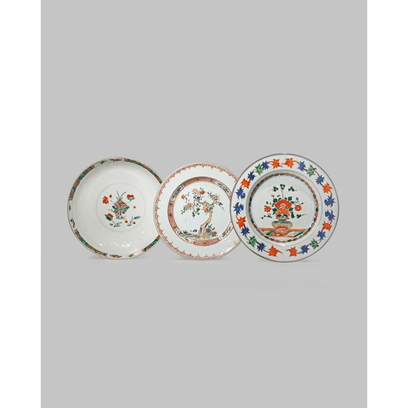 THREE CHINESE FAMILLE VERTE DISHES KANGXI 1662-1722 One painted with a gnarled flowering tree...