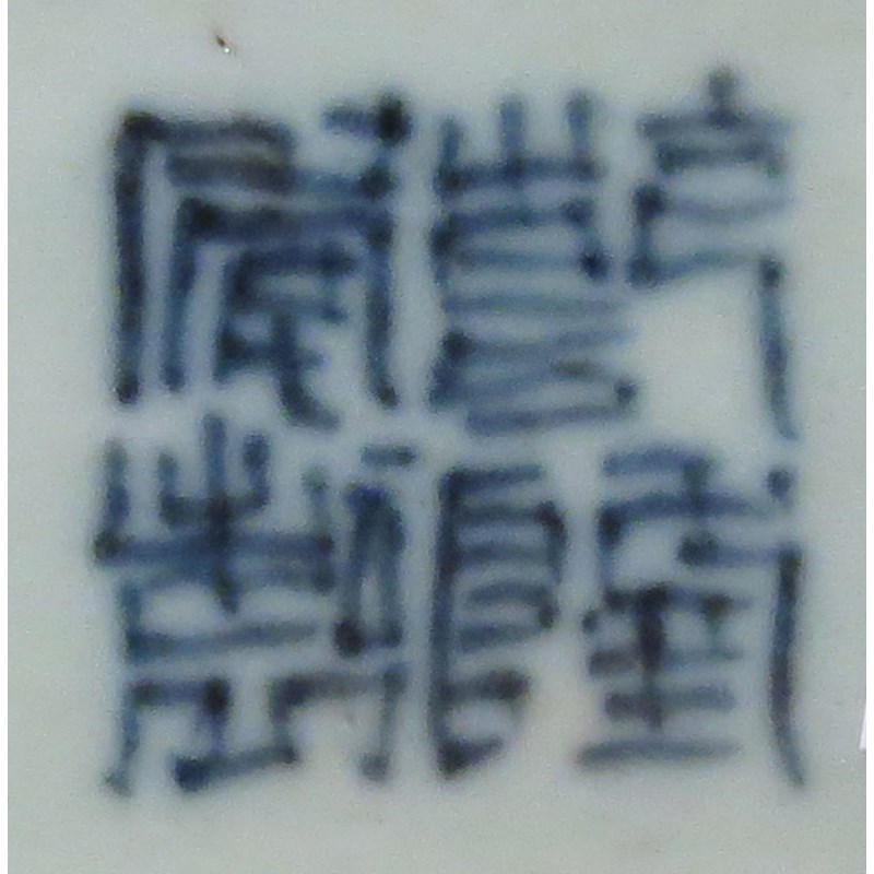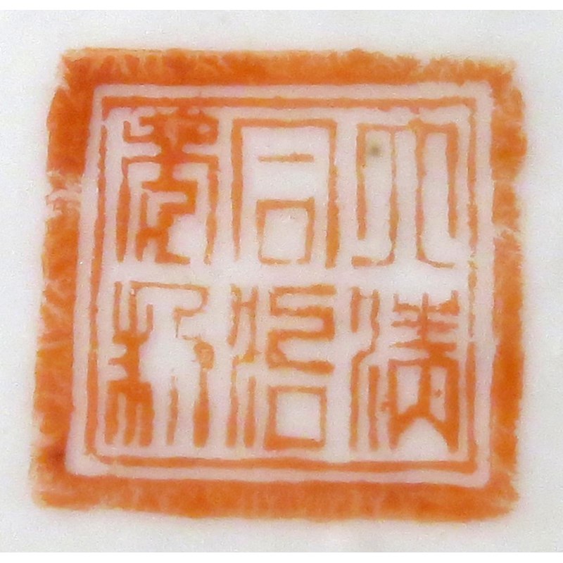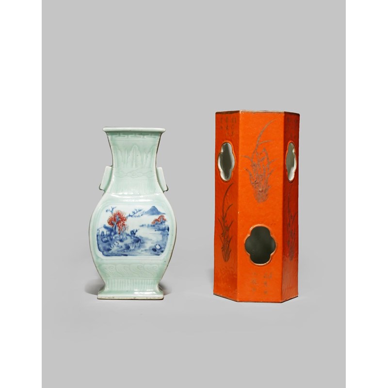 The rectangular-section body moulded with bands of stylized leaves and lappets, painted in underglaze blue and iron-red to each side with a panel depicting mountainous landscapes and small figures, the base with a four character Qianlong mark, and an hexagonal hat stand decorated with sprays of iris on an orange ground, with quatrefoil apertures to each side, a six character Tongzhi mark to the base, 28.8cm. (2)