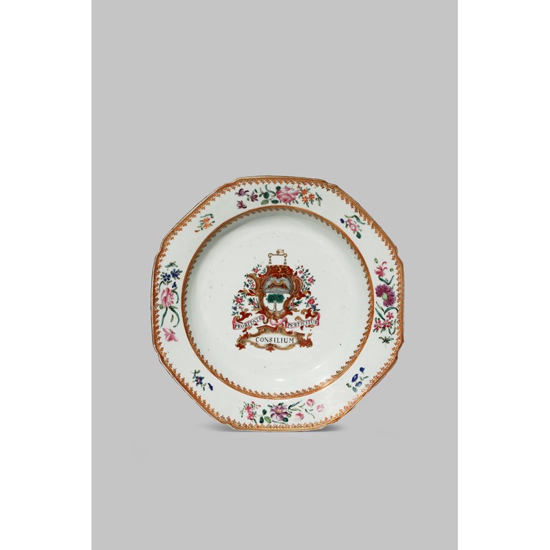 A CHINESE ARMORIAL FAMILLE ROSE OCTAGONAL DISH 18TH CENTURY Painted to the centre with the arms...