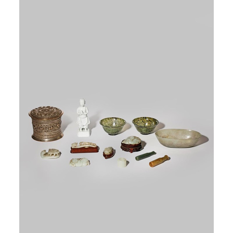 Comprising a Tibetan silver circular box and cover, decorated in relief with animals and birds, a Chinese blanc de Chine figure of a standing boy, and ten jade items, including a belthook, a pair of spinach-green bowls, an oval dish, an archer's ring and other small carvings, three hardwood stands, 16.3cm max. (16)