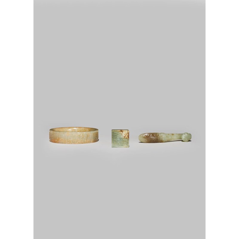 Comprising a belthook carved as a stylized praying mantis, a miniature seal with a four character mark to the base and a bangle, carved in shallow relief with a band of archaic characters, the stones with russet striations, 9cm max. (3)