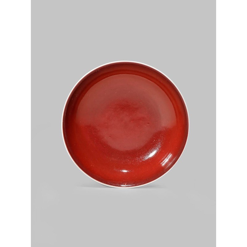 The shallow body decorated all over with a deep red glaze, the rim white, 18cm.