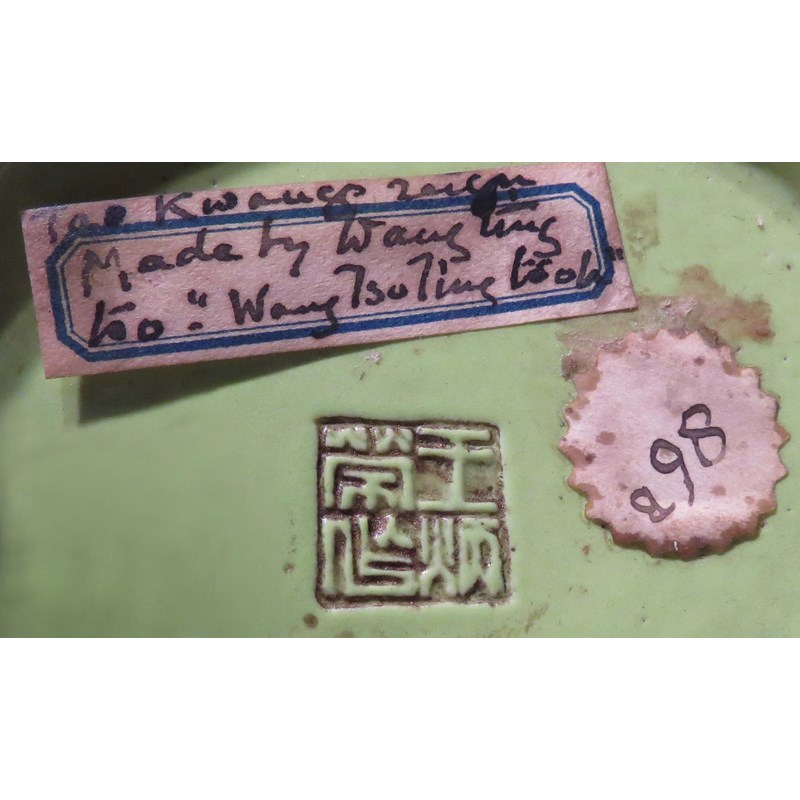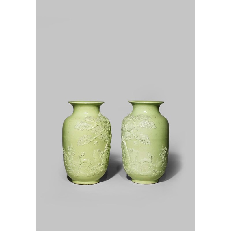 A PAIR OF CHINESE LIME GREEN MOULDED VASES