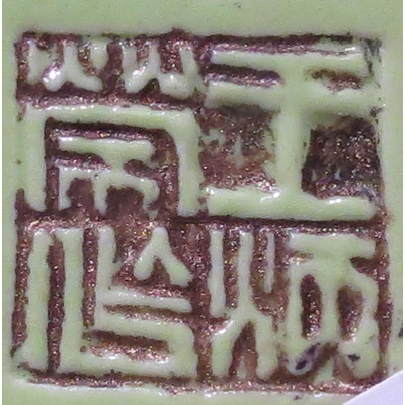 A PAIR OF CHINESE LIME GREEN MOULDED VASES 20TH CENTURY Each decorated with landscapes scenes...