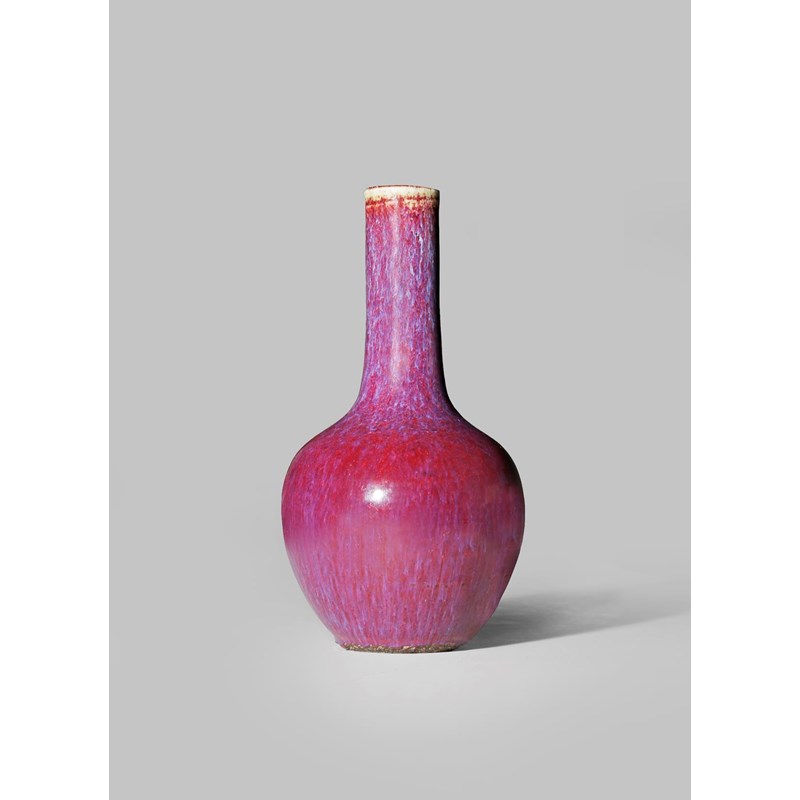 A SMALL CHINESE FLAMBE GLAZED BOTTLE VASE 18TH CENTURY The ovoid body rising to a tall...