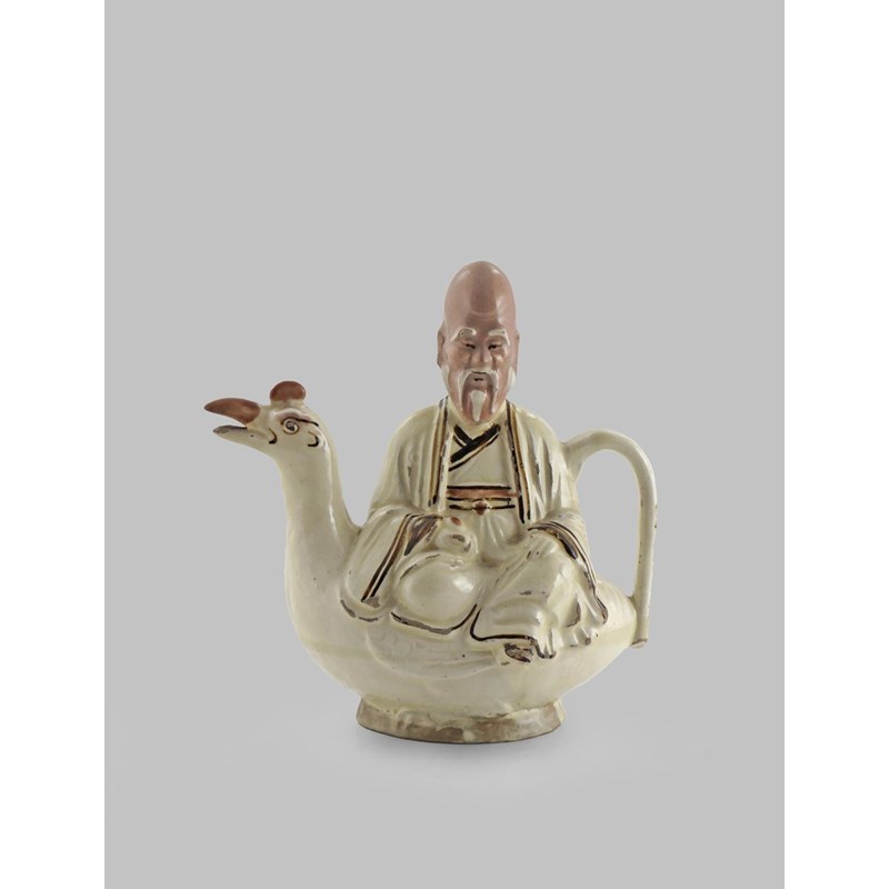 Modelled as Shoulao seated on the back of a large goose, with a gourd to his back forming the cover with its top, the spout the bird's beak, all decorated with cream and brown glazes, 21cm. (2)