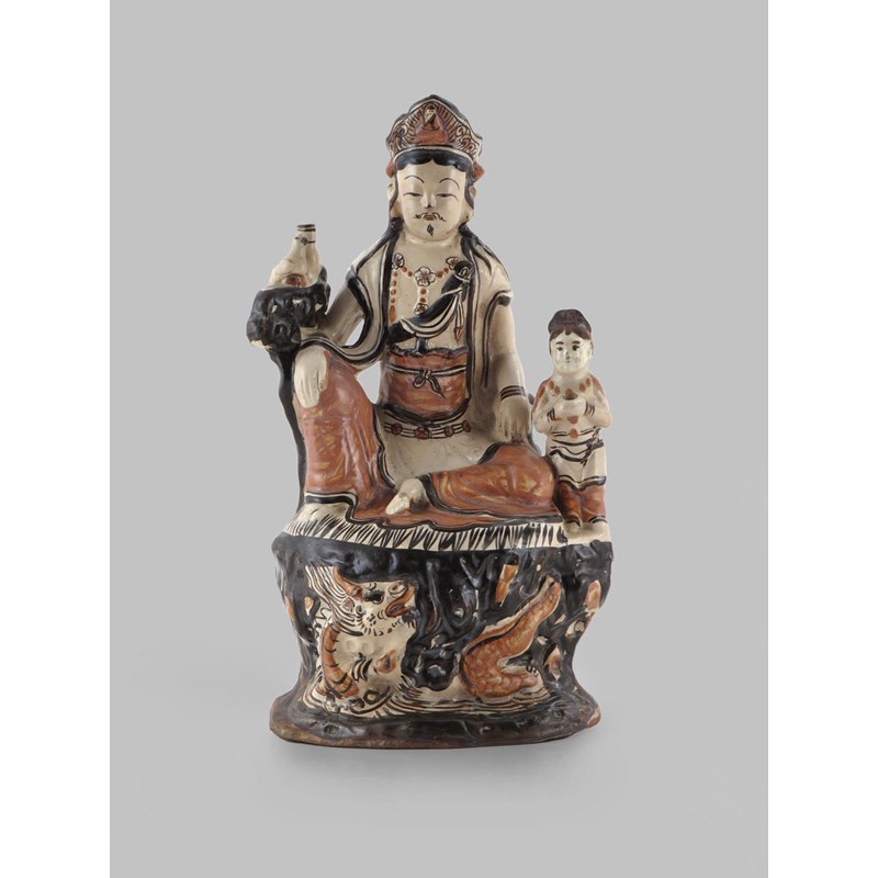 Seated on a tall rocky plinth wearing a headdress, flanked by a bird to one side, a small child holding a bowl to the other, a ferocious dragon writhing beneath, decorated in cream, brown and russet glazes, 30.5cm.