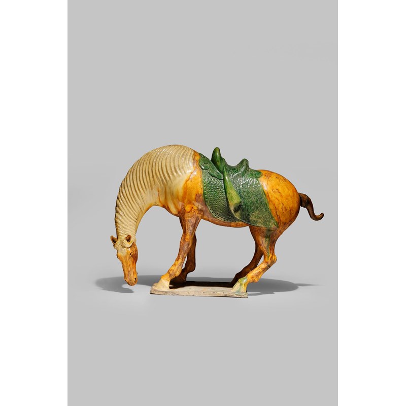 Standing with its head lowered and turned to one side as if to graze, a saddle cloth and saddle upon its back, decorated with sancai glazes, mounted on a rectangular plinth, 64cm.