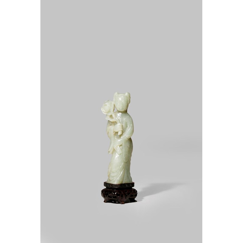 A CHINESE CELADON JADE CARVING OF A YOUNG WOMAN LATE QING DYNASTY Standing holding a large flower...