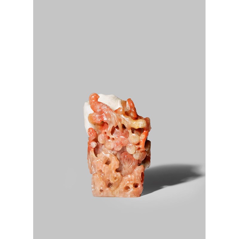 Carved as a section of a tree trunk, with gnarled pine branches and bamboo extending around the exterior and lingzhi fungi emerging from rocks beneath, a single long-tailed bird perched in the branches, 11.1cm.