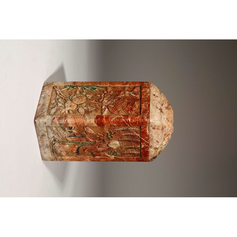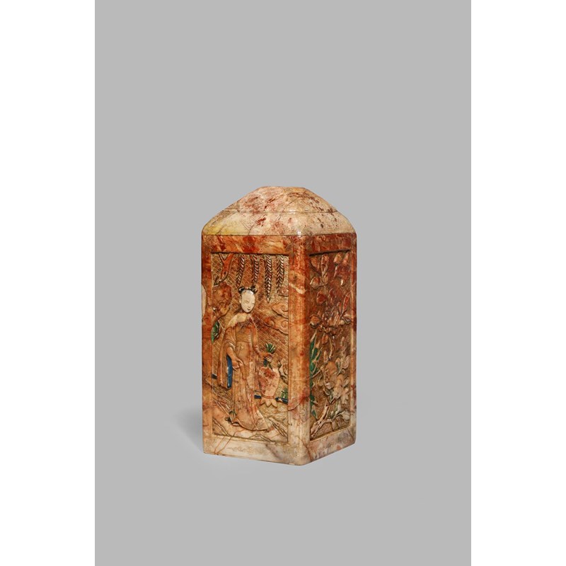 A RARE CHINESE SOAPSTONE SQUARE SECTION FLASK EARLY QING DYNASTY Two sides carved in relief with...