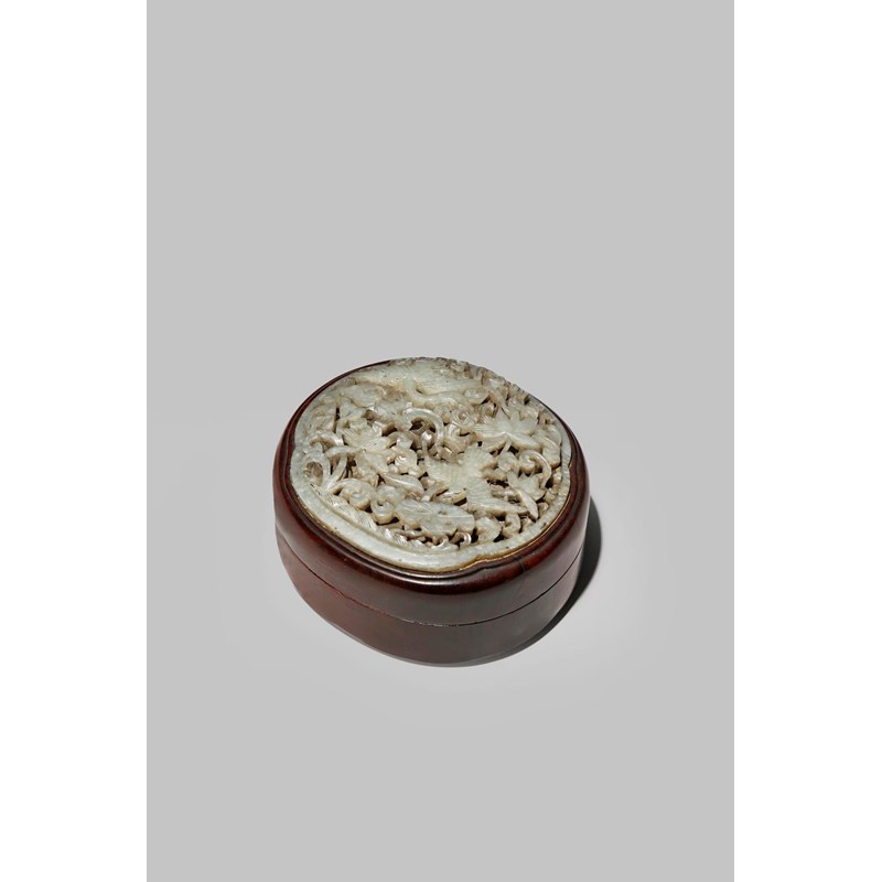The openwork quatrefoil plaque carved with two birds in flight amongst lotus flowers and scrolling leafy tendrils, mounted into the top of a later hardwood box, 9cm. (2)