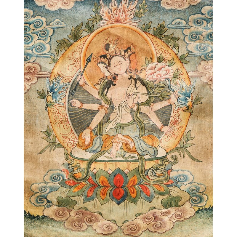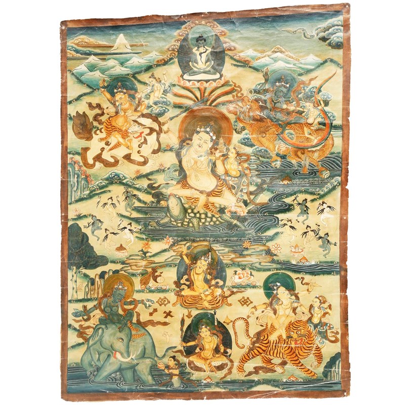 One painted with Usnisavijaya raised on a lotus throne, the other with a central deity surrounded by numerous other figures and animals, both mounted with silk borders and framed and glazed, 48cm x 36cm. (2)