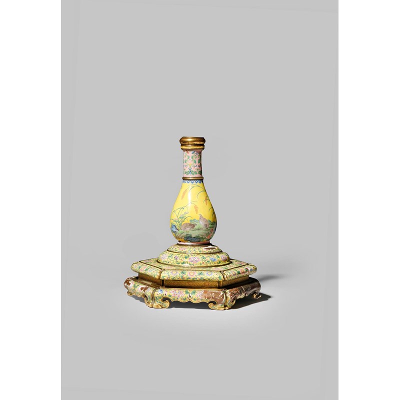 The slender pear-shaped body painted with two quails beneath millet and blue rocks on an Imperial yellow ground beneath a border of small blue ruyi heads and a central gilded collar. The cylindrical neck with a formal flower and leaf scroll on a pink ground, together with, and attached to, a hexagonal enamel base painted with further flower heads and leaf scrolls on a yellow ground raised on six lingzhi-shaped feet, the remains of a paper label, the vase 12cm, 20cm (overall).