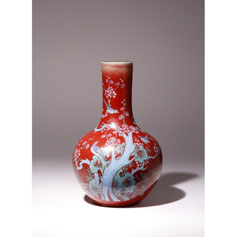 Painted with four birds amidst prunus branches, all set against a deep red glaze, the base and interior covered with greyish white glaze, 38cm.