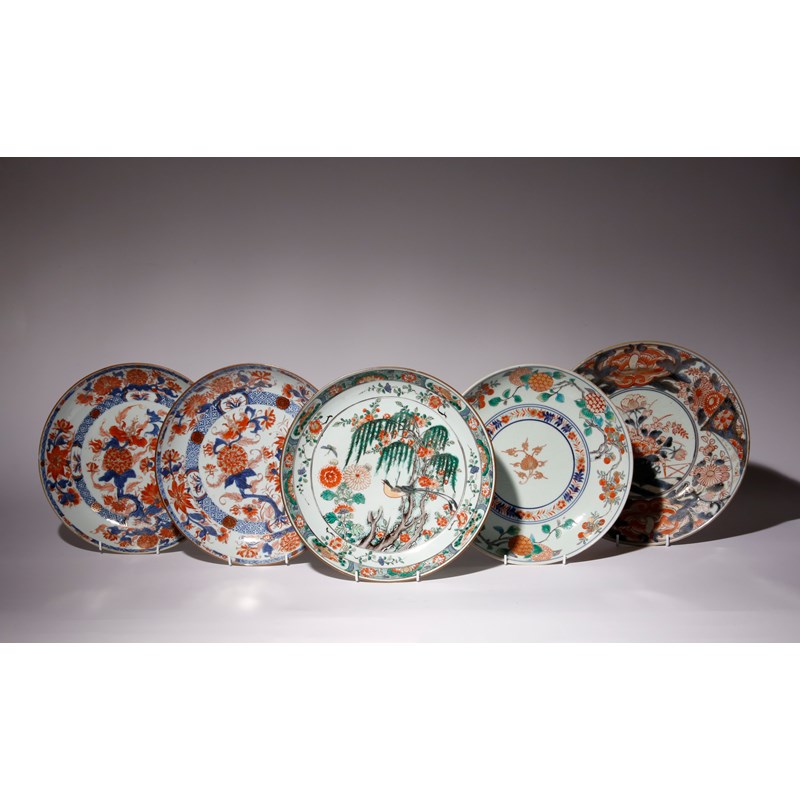 Comprising: a Chinese famille verte dish painted with a bird in a tree, a pair of Chinese Imari dishes, a Japanese Imari dish, and a Japanese verte Imari dish, 28.5cm max. (5)