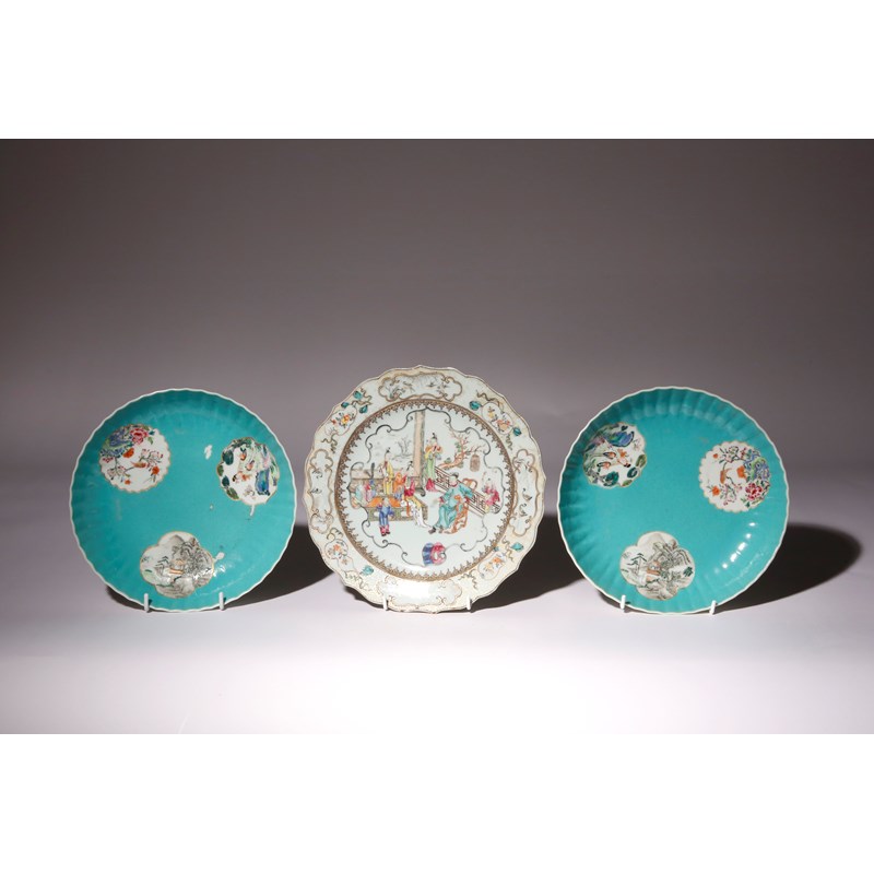 A PAIR OF CHINESE FAMILLE ROSE TURQUOISE-GROUND DISHES