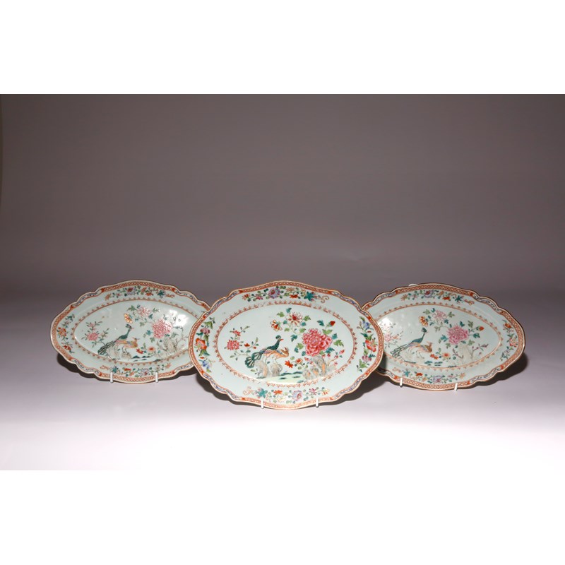 THREE CHINESE FAMILLE ROSE 'DOUBLE PEACOCK' DISHES