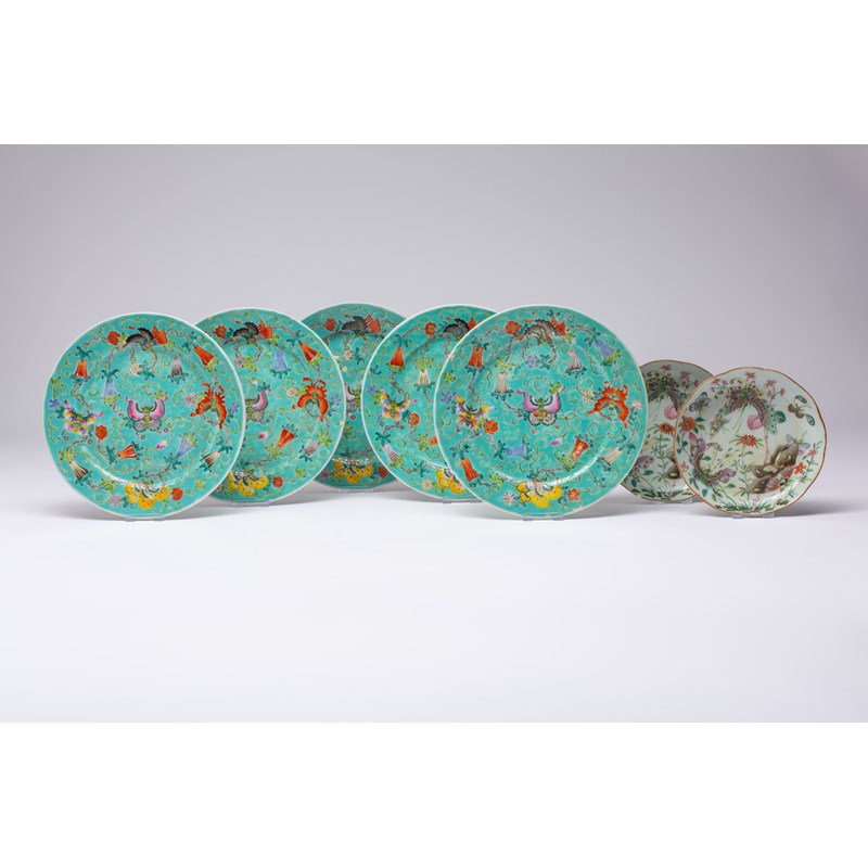 FIVE CHINESE FAMILLE ROSE PLATES