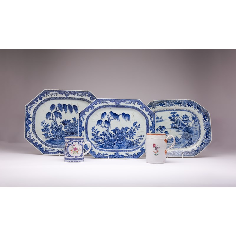 THREE CHINESE BLUE AND WHITE OCTAGONAL MEAT PLATES AND TWO MUGS