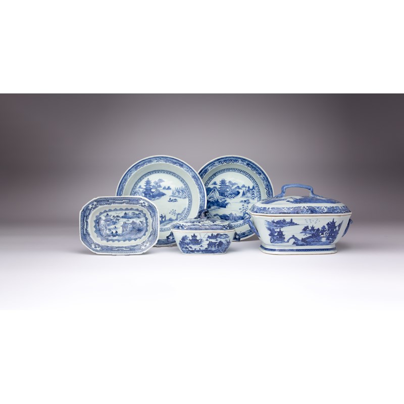Provenance: from a British private collection, formed 1970-2003, the smaller tureen, cover and stand purchased from Christie's, 25th November 1999, lot 620; the larger tureen and cover from Christie's, 26th November 1998, lot 438; the two plates from Christie's 24th June 1999, lot 457.