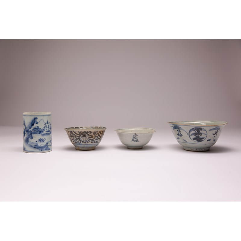 Comprising: a cylindrical brushpot, painted with a fisherman on a sampan in a river landscape, and three bowls variously decorated with floral designs, trees and shou characters, 19.2cm max. (4)