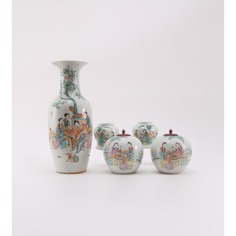 Comprising: a baluster vase and four jars, each decorated with beauties and children in a fenced garden, the reverse with calligraphic inscriptions, with two wood covers, 58cm max. (7)