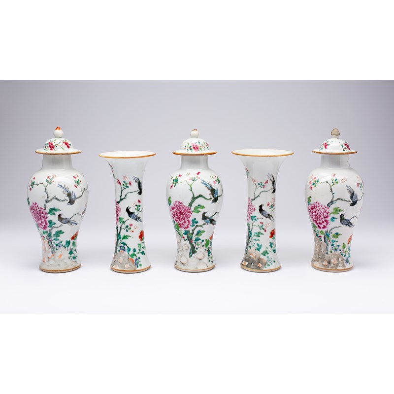 A CHINESE FAMILLE ROSE FIVE-PIECE 'TWIN MAGPIES' GARNITURE
