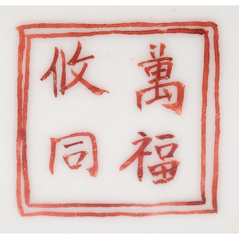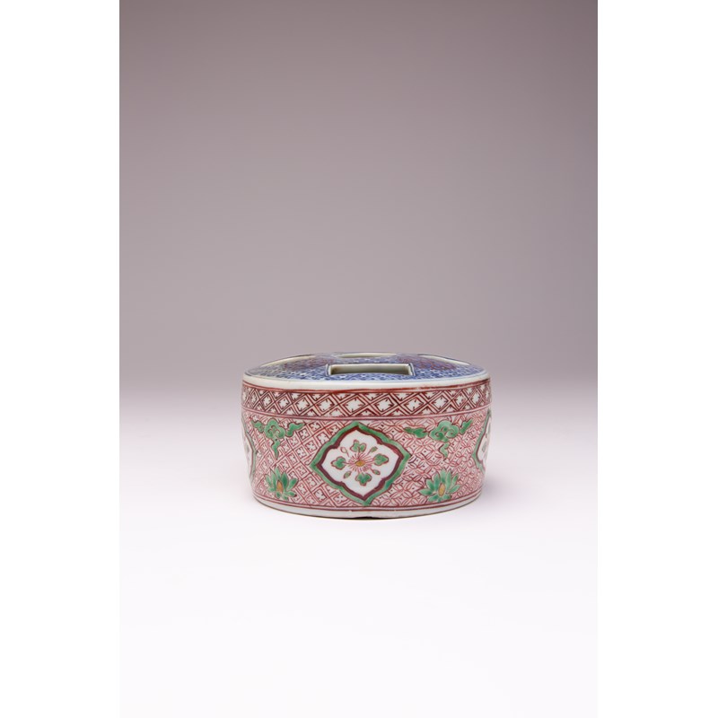 Drum-shaped, the top with four circular and one rectangular apertures separated by flowerheads in underglaze blue and iron-red, the side painted with floral and cloud designs, all against a cell diaper-ground, the base with a mark reading wan fu you tong, (the enamels perhaps later), 3.5cm.