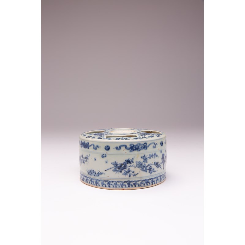 Drum-shaped, the top with three circular and one rectangular apertures separated by scrolling foliage, surrounding an unglazed biscuit circle, the side painted with birds perched on floral branches, the base with a shou shan fu hai mark, 13.5cm.