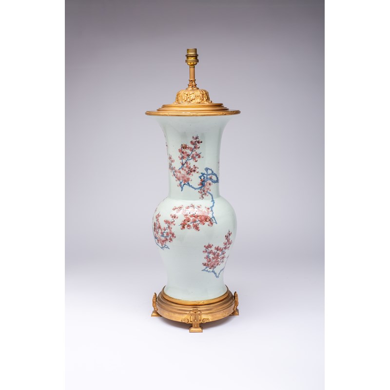 Decorated with twisting gnarled branches of prunus blossoms and buds, mounted with ormolu as a table lamp, 45cm the vase, 67cm overall.
