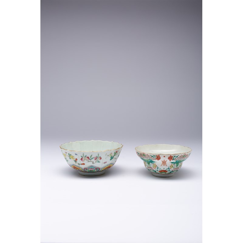 TWO CHINESE FAMILLE ROSE FOLIATE BOWLS