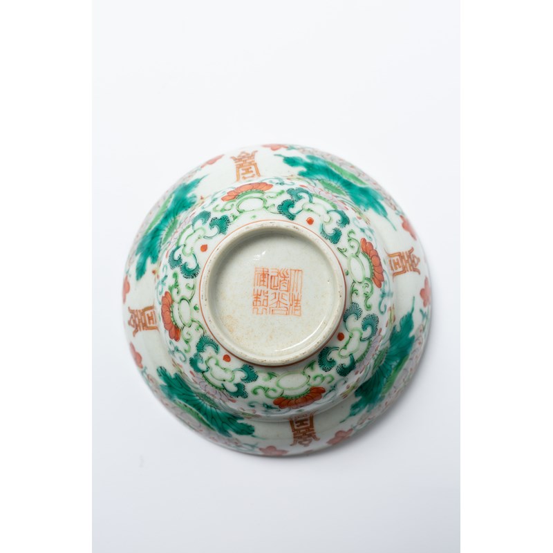 One ogee-shaped, painted with large lotus blooms and shou characters, with a Daoguang mark, the other moulded bowl painted with fruits and flowers and lappets of lotus scrolls and bats, with a Jiaqing mark to the base and of the period 1796-1820, 12.8cm and 14.5cm. (2)