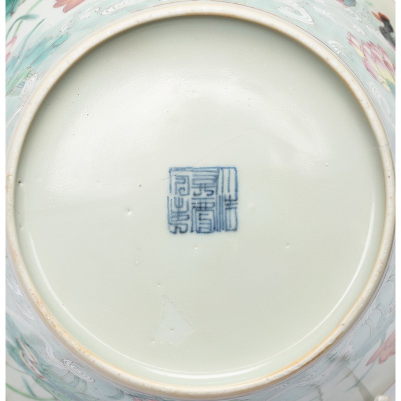 The exterior painted with a pair of ducks swimming in a lotus pond, the interior decorated with finger citron, peach and pomegranate on leafy stems, surrounded by three bats in flight, 19.3cm.