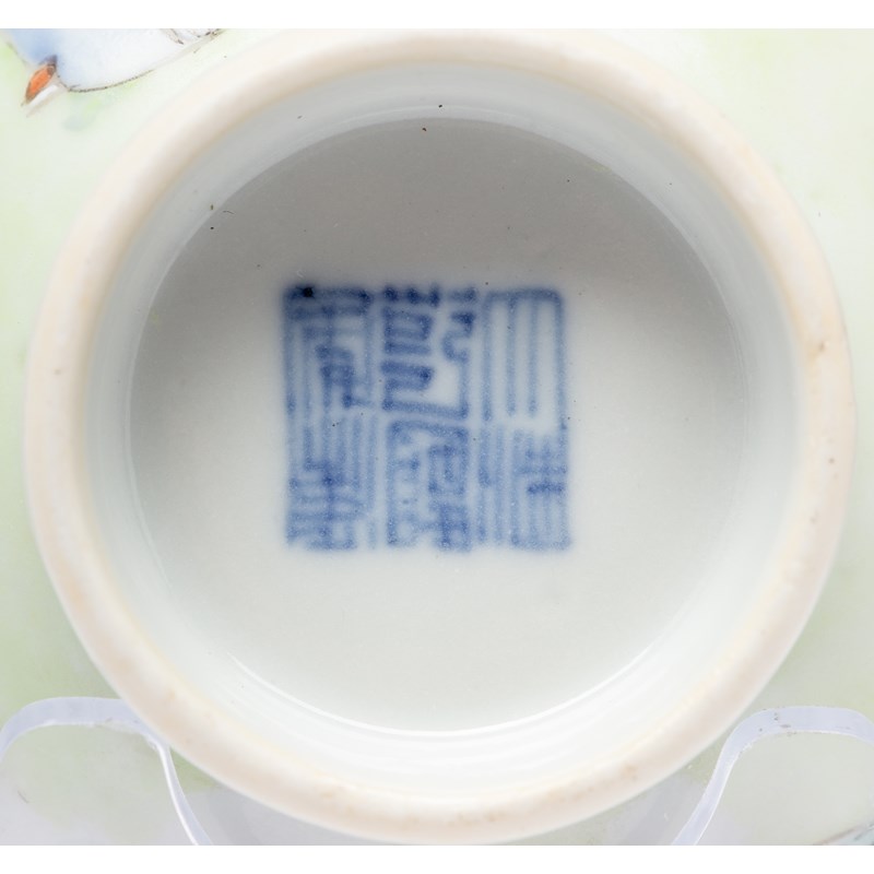 One decorated with the Sanxing, the other with four warriors, the former with a Qianlong mark, the latter with a Kangxi mark, 10.2cm max. (2)