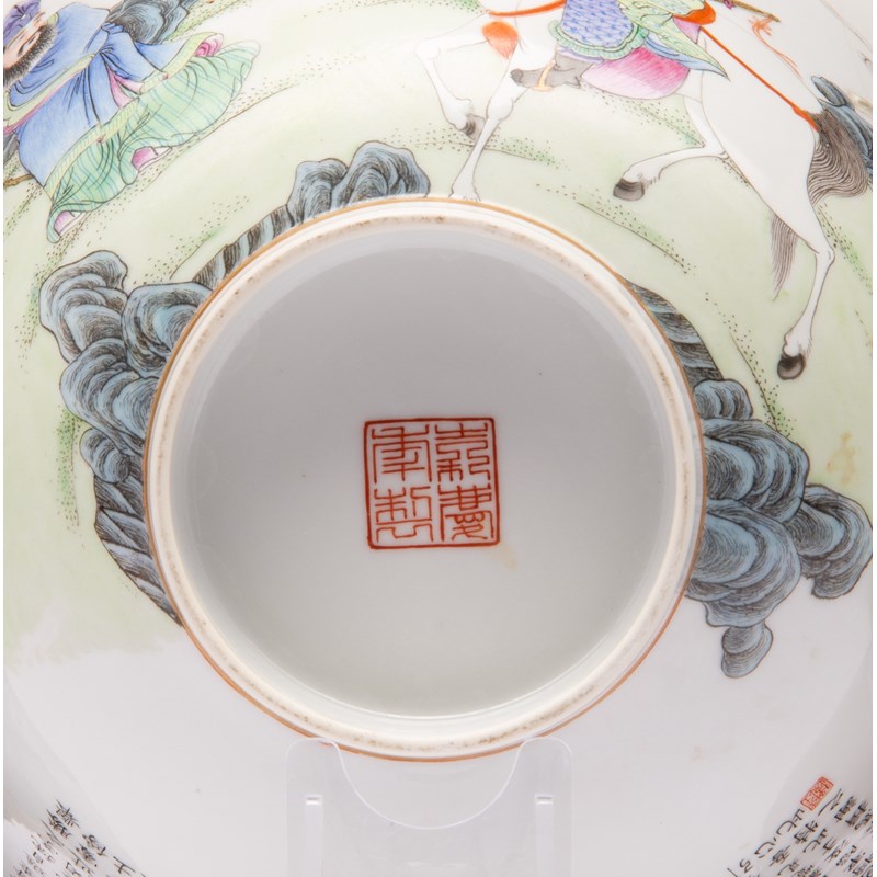 Painted with Lu Xun as a young boy on horseback, and a bearded man, with lines of calligraphy to the reverse, the base with a Jiaqing mark, 20.5cm.