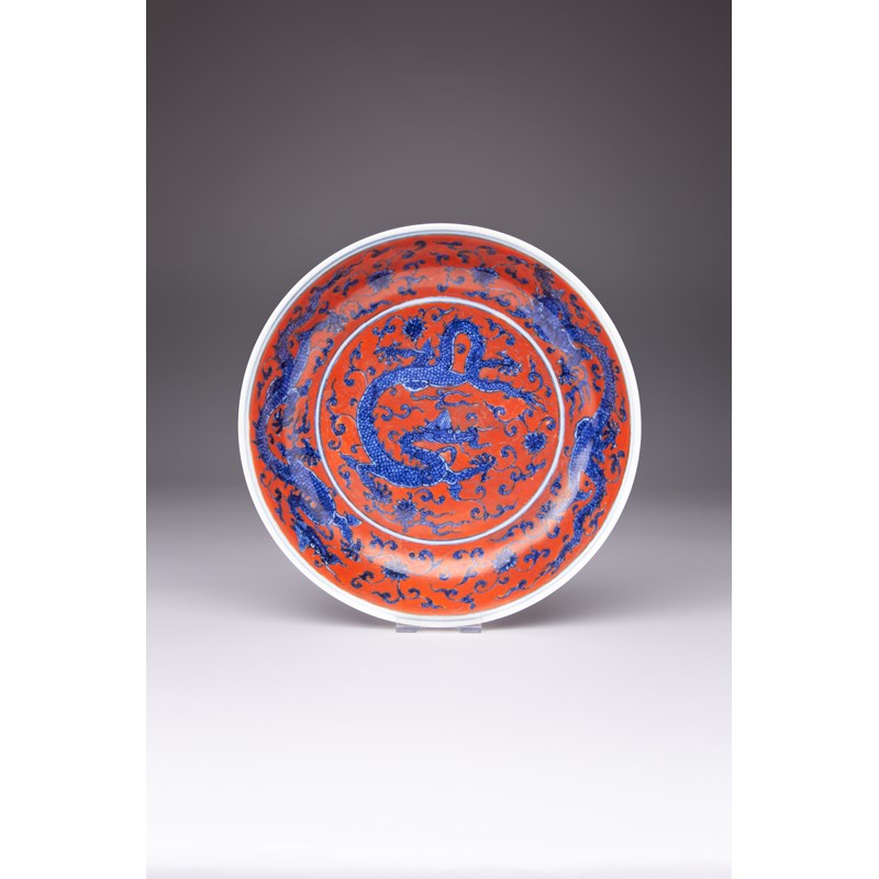 A CHINESE UNDERGLAZE BLUE AND IRON-RED DECORATED 'DRAGON' DISH