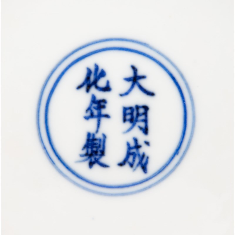 Painted with a dragon amidst lotus scrolls, the cavetto and the underside similarly decorated with two further striding dragons, the base with a Chenghua mark, 19.2cm.