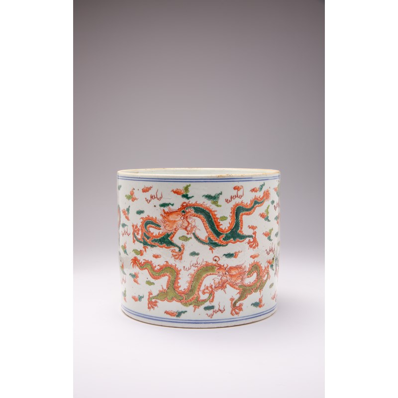 A LARGE CHINESE FAMILLE VERTE CYLINDRICAL 'DRAGON' BRUSHPOT, BITONG