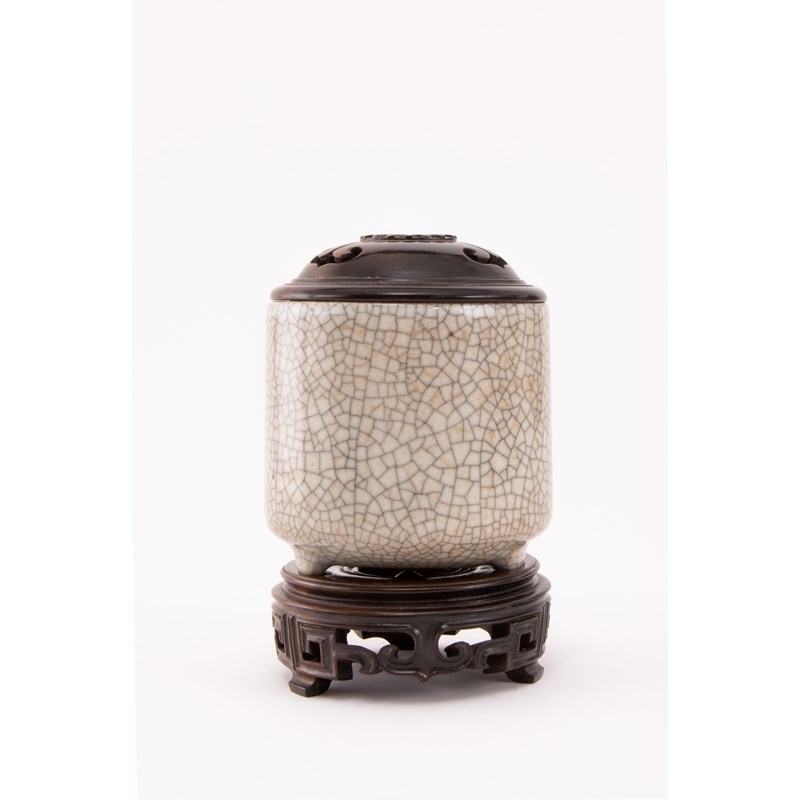 The circular body covered in greyish glaze suffused with dark crackles, together with a reticulated wood cover and stand, 9.7cm. (3)