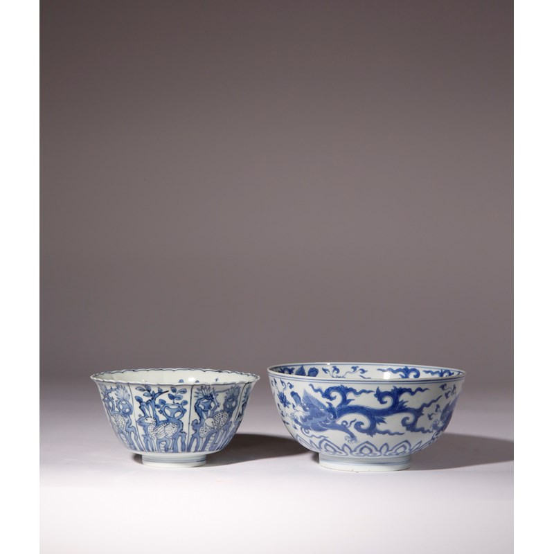 The larger bowl painted with striding makara dragons chasing stylised lotus blooms, the base with a Chenghua mark, the kraak bowl decorated with panels containing deer and foliage emerging from the rocks, 18cm and 14.8cm. (2)
