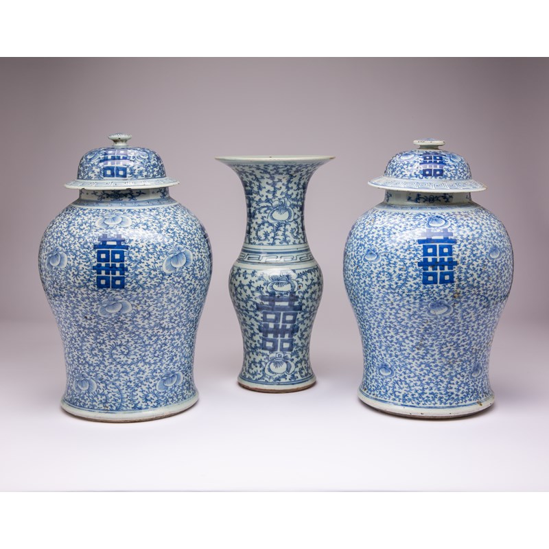 A NEAR PAIR OF CHINESE BLUE AND WHITE BALUSTER VASES AND COVERS