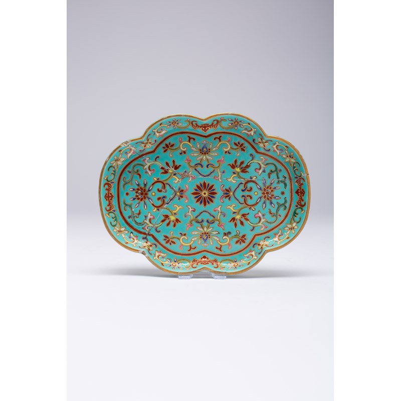 A CHINESE PORCELAIN HEXAFOIL IMITATION CLOISONNE DISH