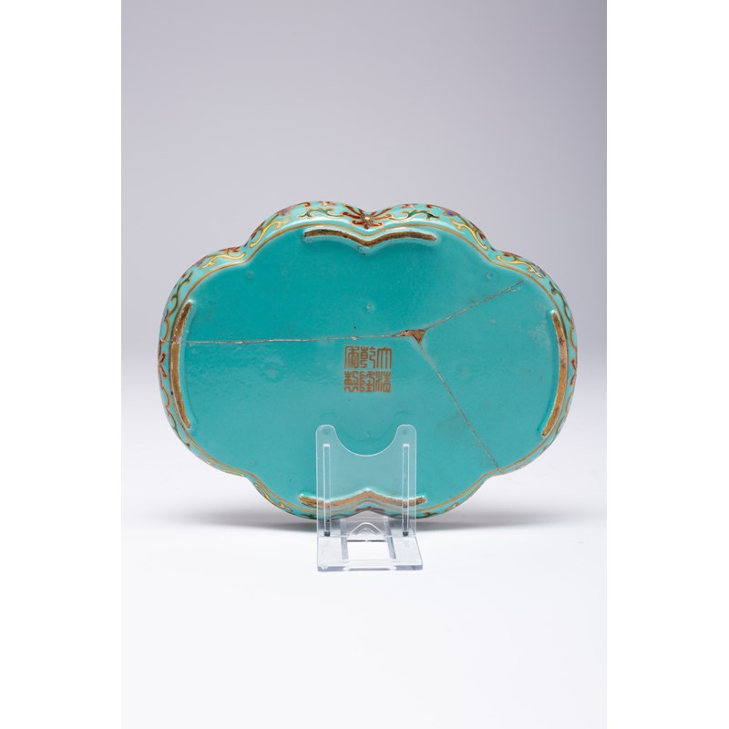 Painted with stylised lotus amidst scrolling tendrils, with four bats at the rim, set against a turquoise ground, 18.1cm.