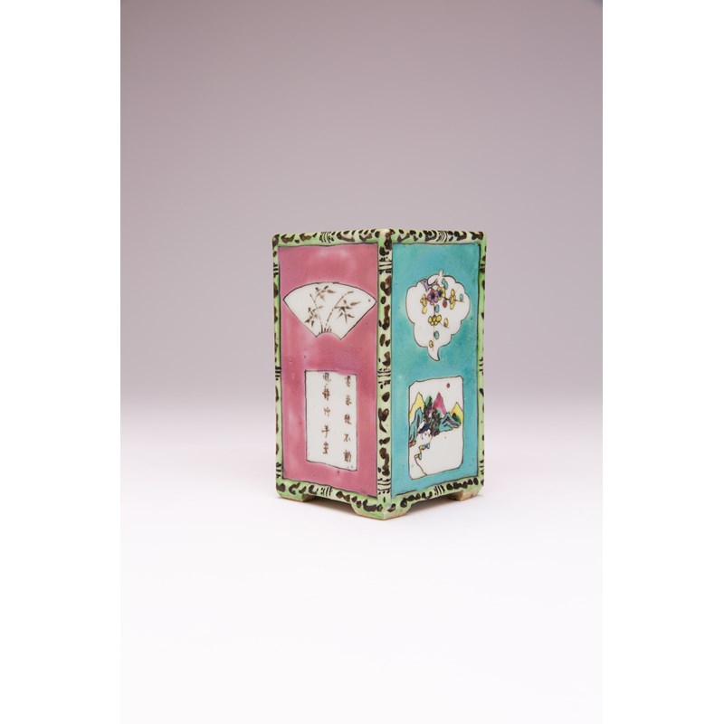 A CHINESE FAMILLE ROSE SQUARE-SECTION BRUSHPOT